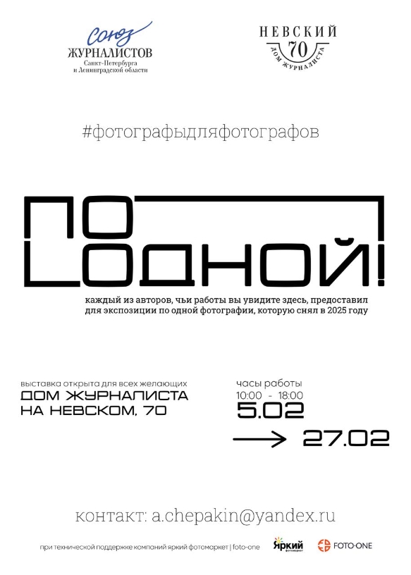 5 февраля на Невском, 70 открылась выставка российских фотографов-документалистов «ПО ОДНОЙ!», организованная по инициативе Гильдии фотожурналистов СЖ СПб и ЛО. Каждый из 50 авторов экспозиции предоставил, по своему усмотрению, по одной фотографии, которую снял в прошлом году.